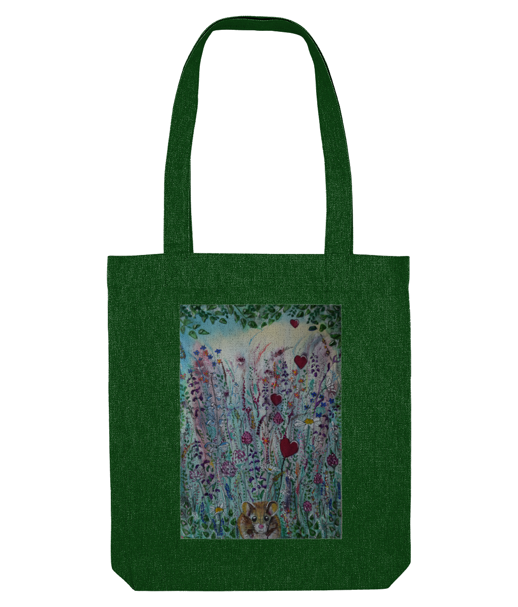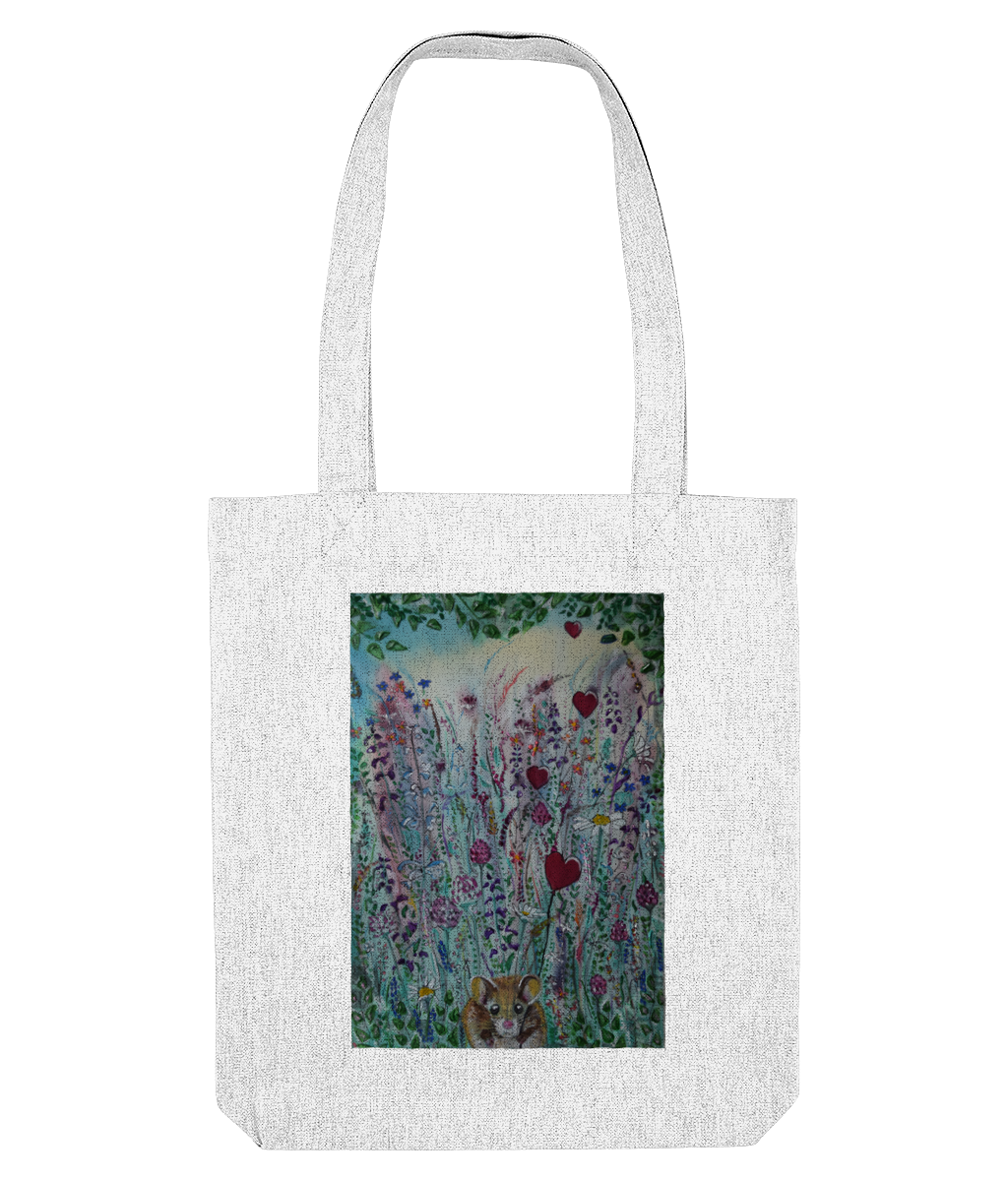 This charming design captures a mouse nestled in a colourful meadow filled with wildflowers and hearts.